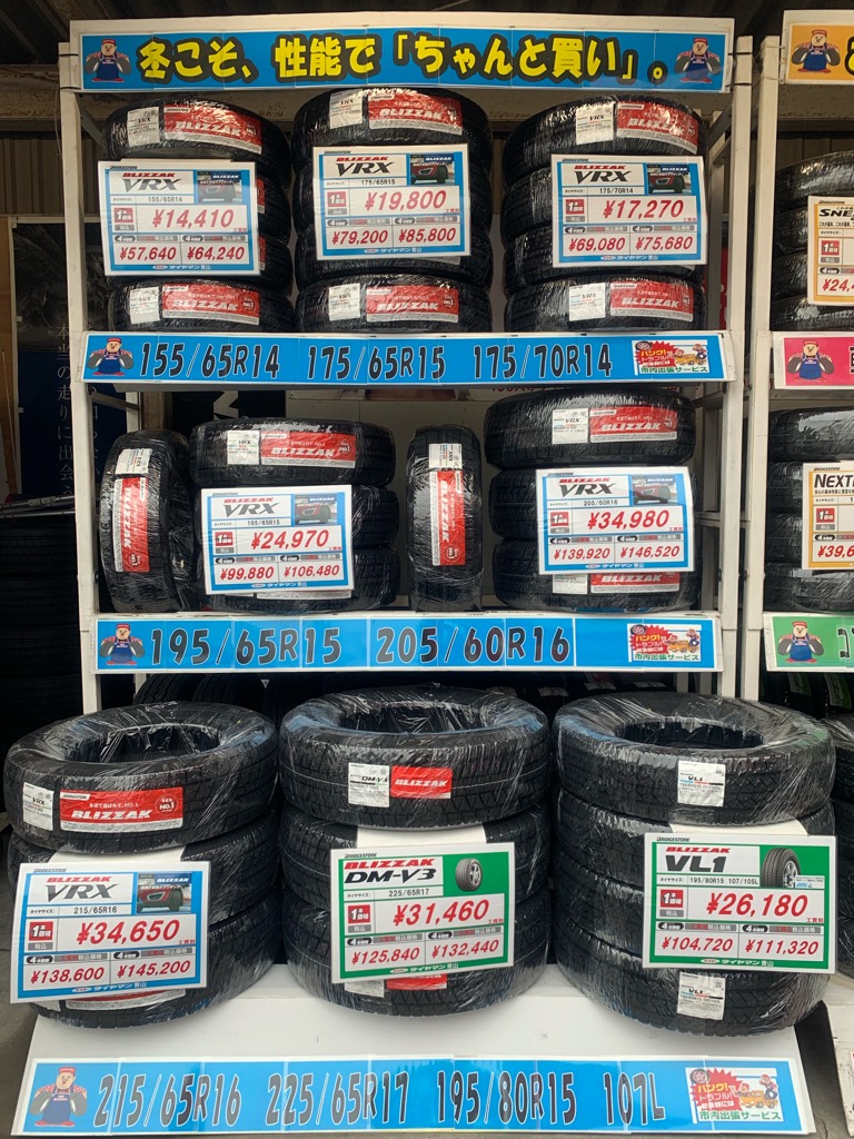 上段から軽自動車、コンパクトカー用。中段にはミドルミニバンで鉄板の195/65R15と205/60R16。下段へ200系ハイエース、NV350キャラバンサイズと新商品のSUV専用ブリザックDM-V3です。
